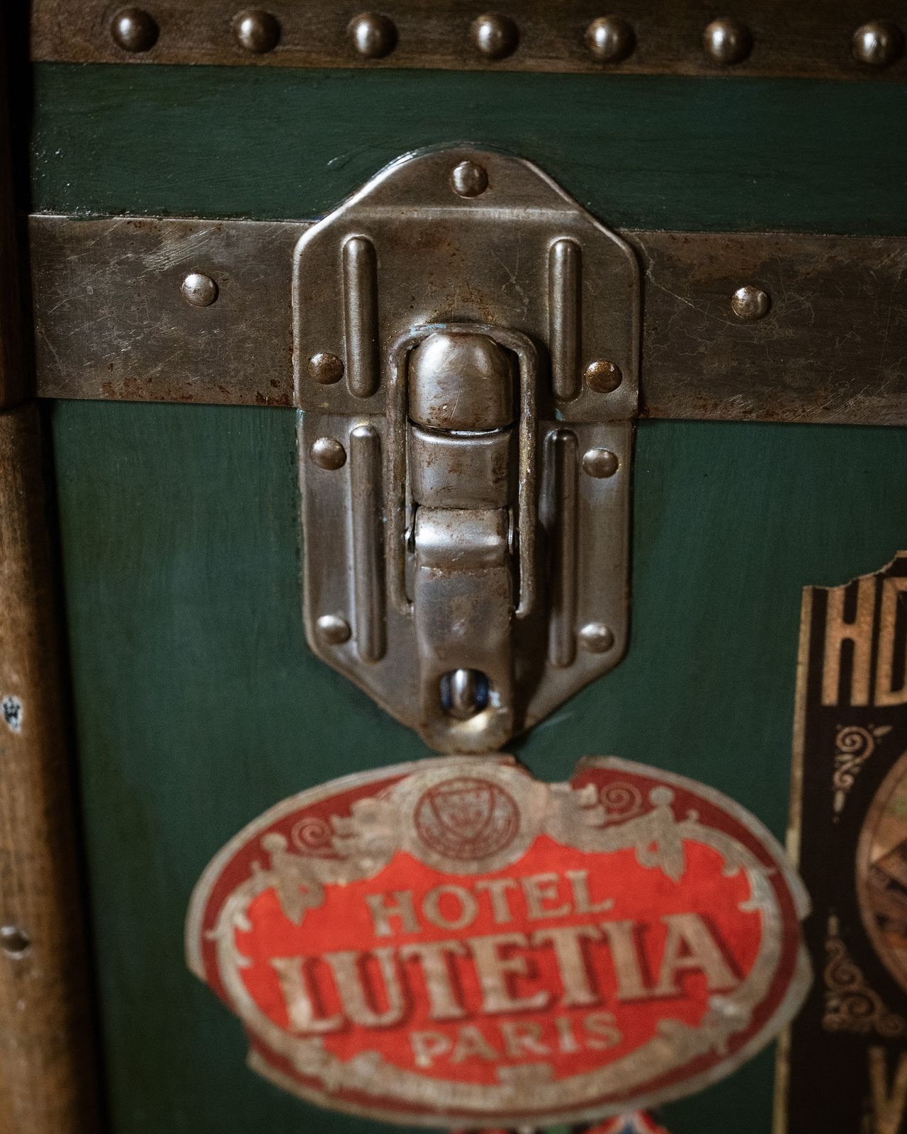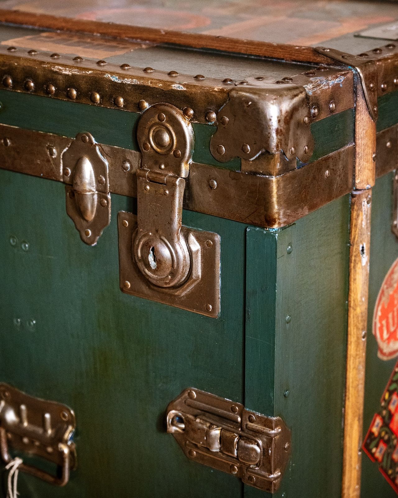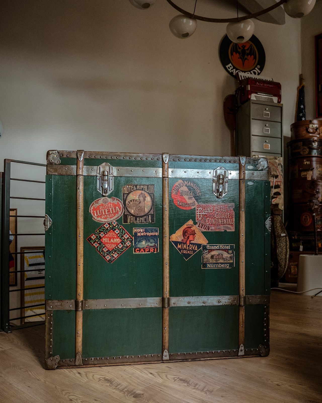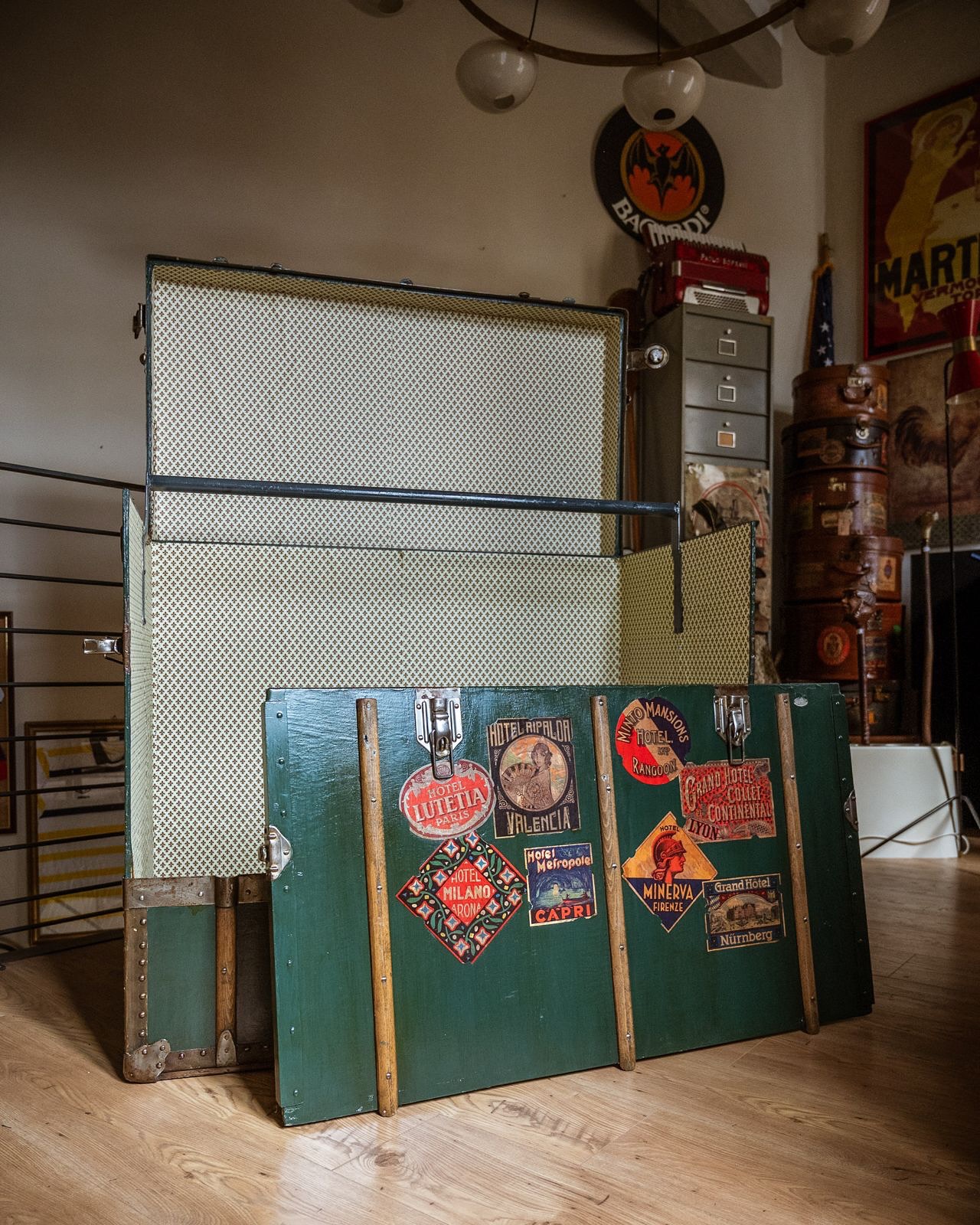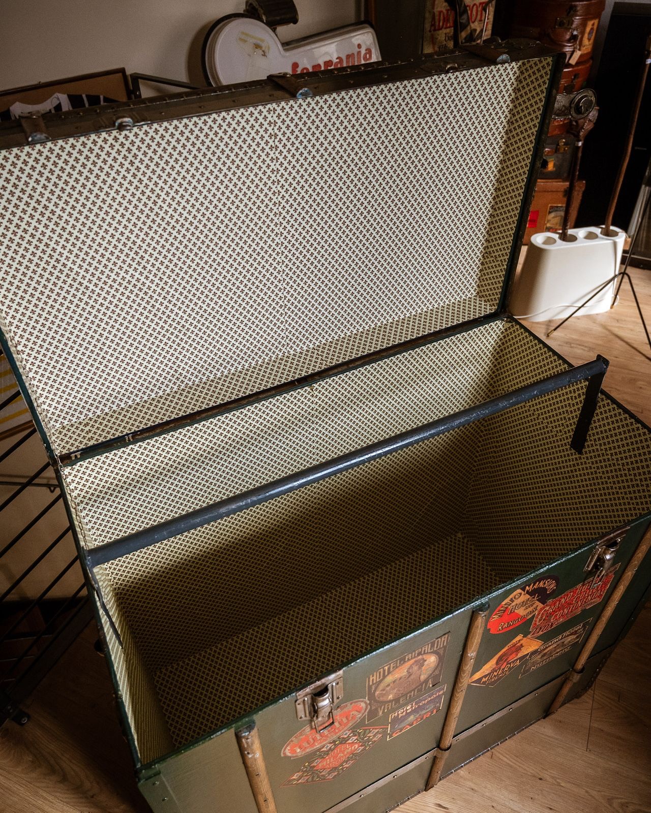 Baule da teatro , tutto restaurato . Il pannello frontale si smonta favorendo un pratico inserimento degli abiti sul bastone interno. Misure: larghezza cm 100 , profondita’ cm 57, altezza cm 93