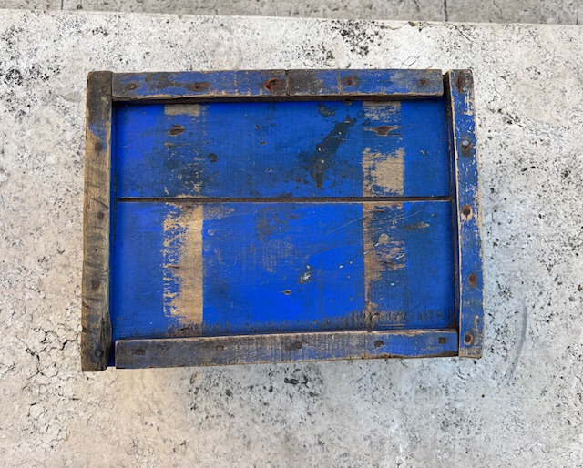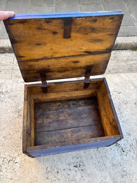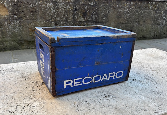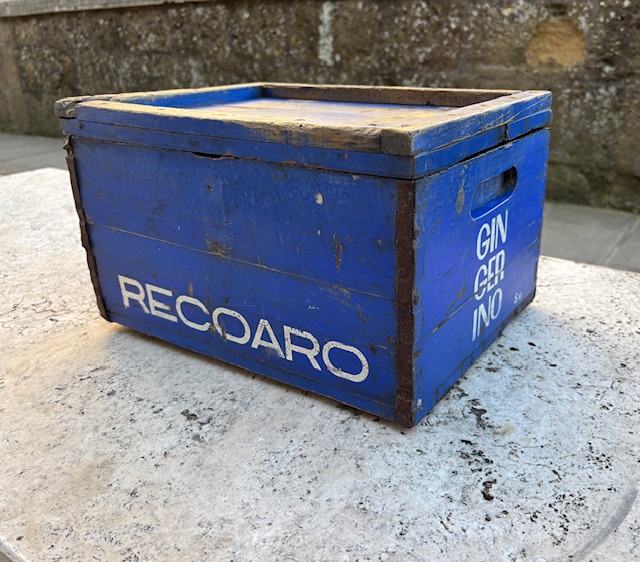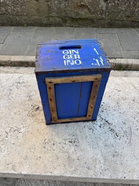 Cassetta contenitore Recoaro Gingerino con coperchio, restaurata mantenendo i colori originali.