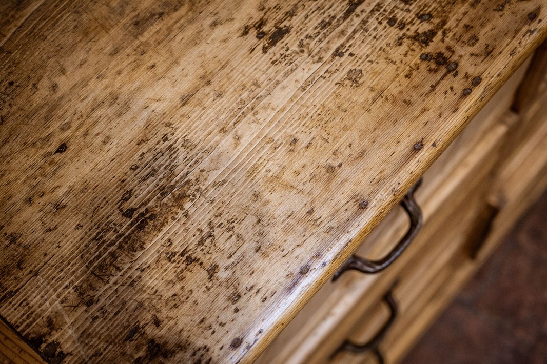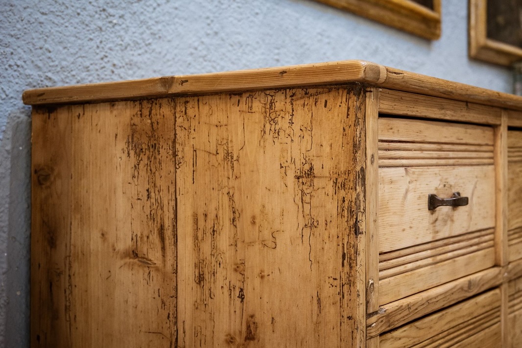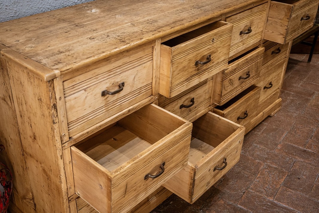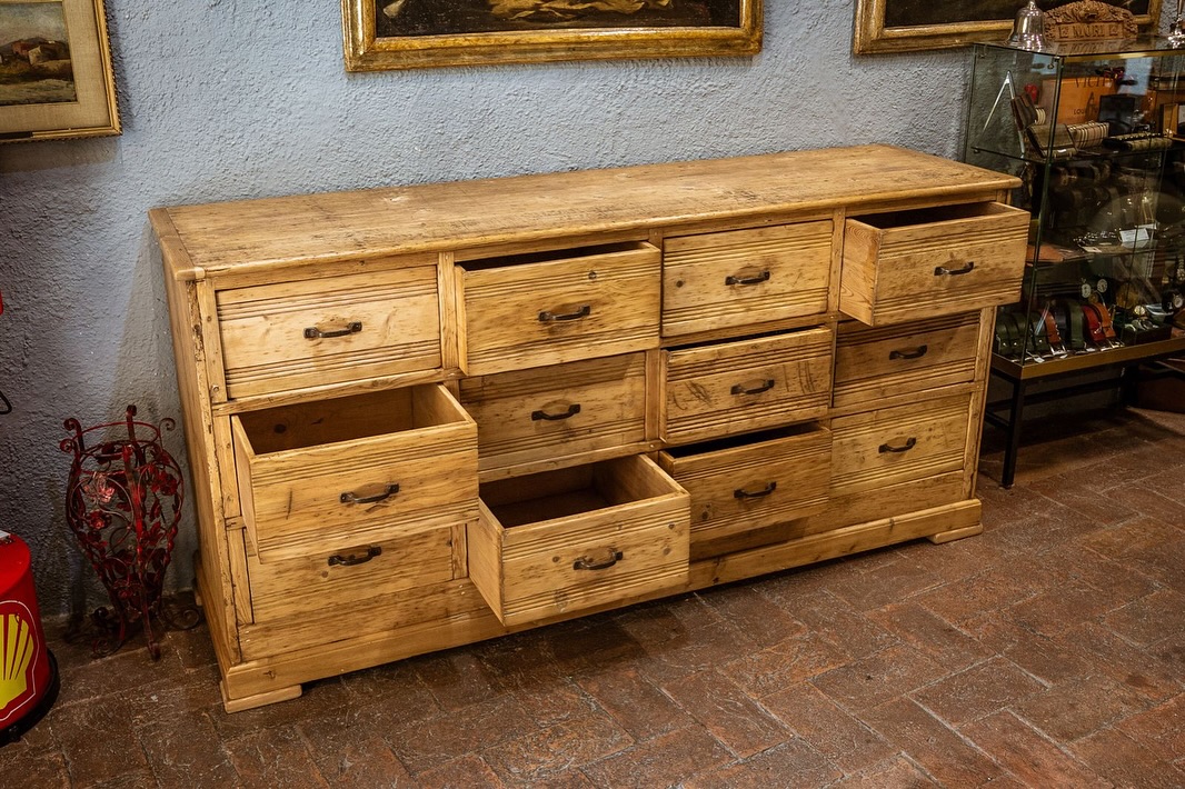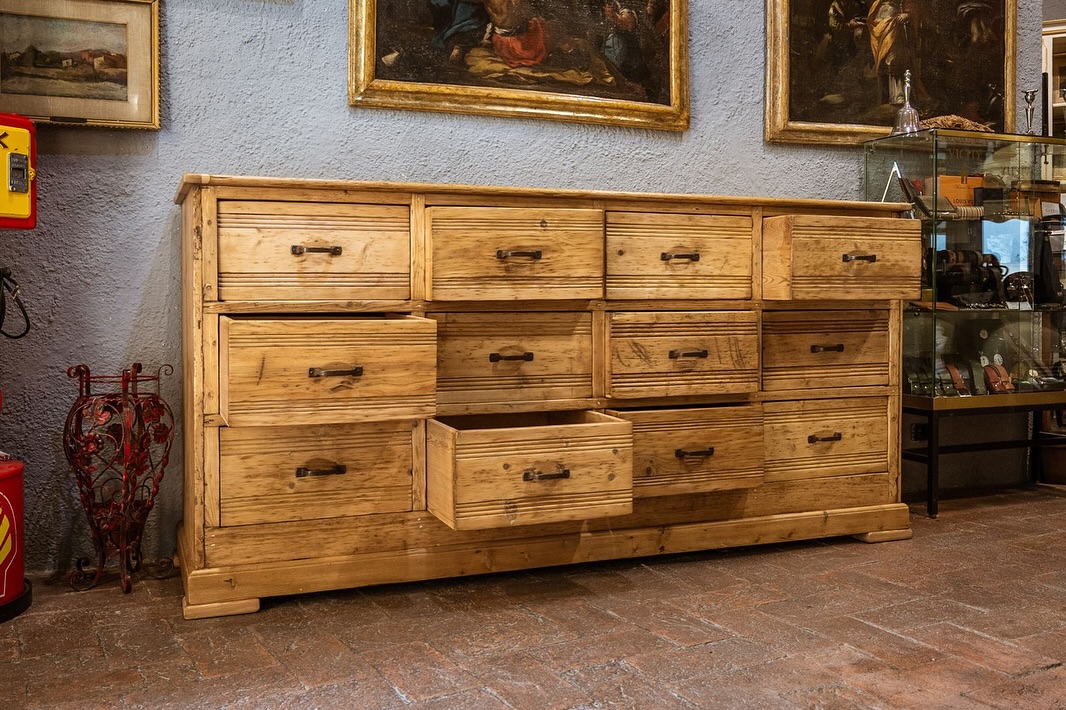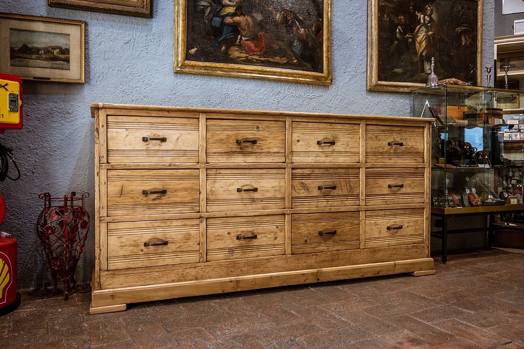 Grande cassettiera da mercante in perfetto stile industriale ,legno di pino restaurata al naturale , presenta dodici grandi cassetti con maniglie originali .