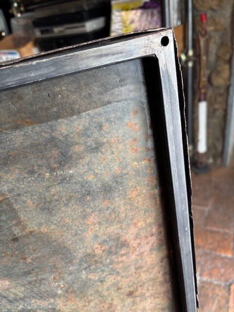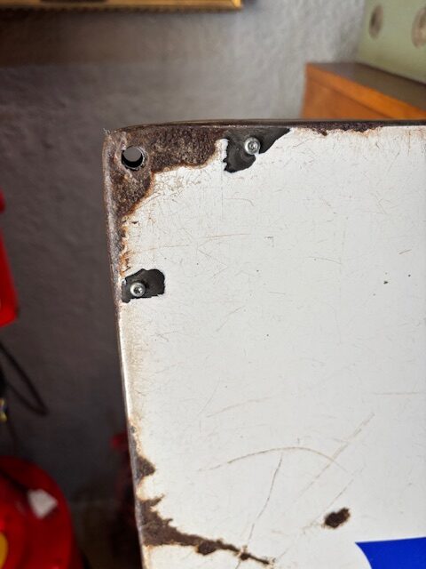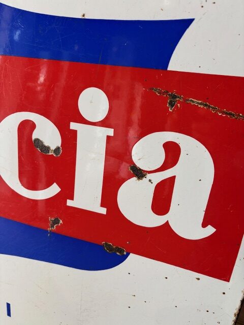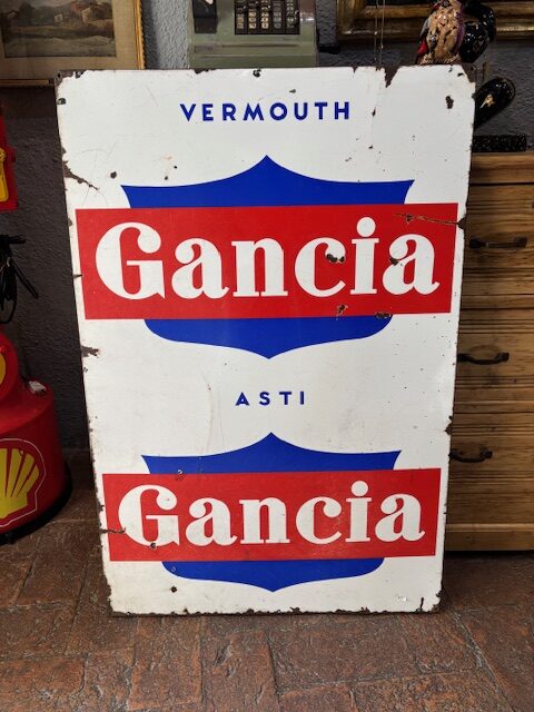 Insegna smaltata Gancia anni ’60 , abbiamo aggiunto un telaio di ferro sul retro per renderla piu stabile.