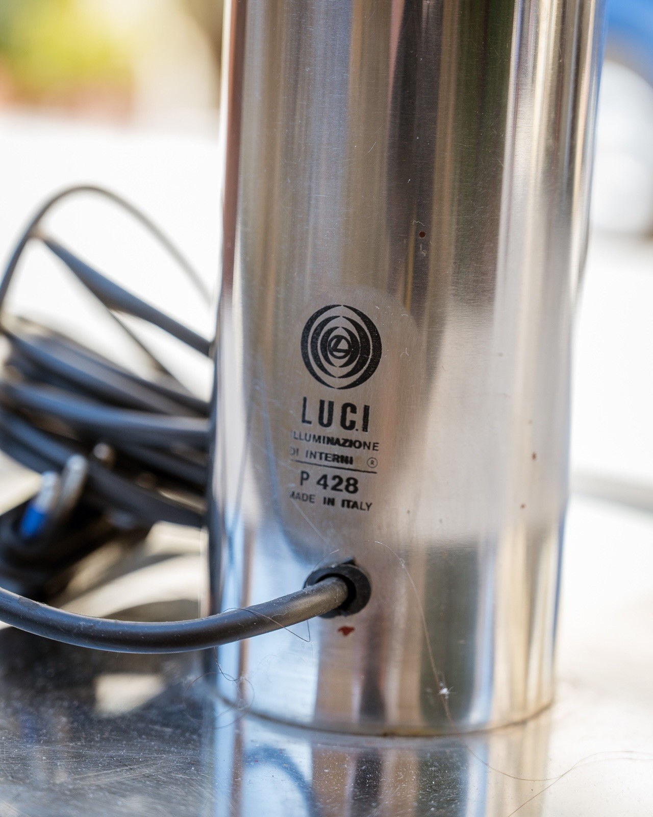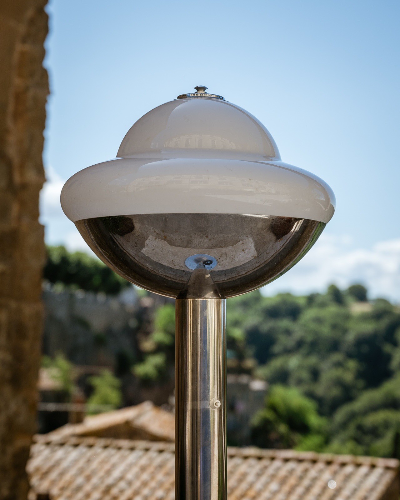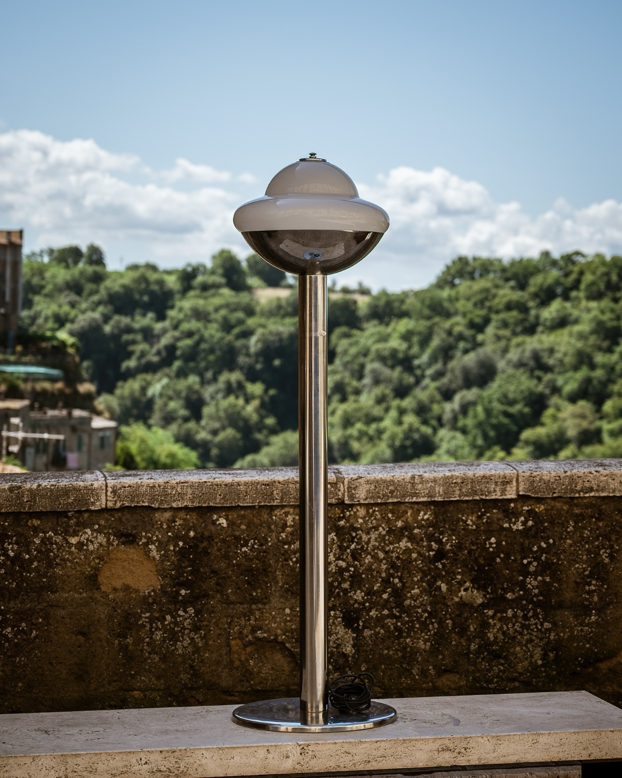 Lampada da terra Luci P428 ,Italia 1970 con testa a fungo, struttura tubolare cromata e opalina paralume in plexiglass. Impianto elettrico originale, altezza cm 157